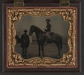 | Keywords: library of congress libraryofcongress dc:identifier=http://hdl.loc.gov/loc.pnp/ppmsca.27131 dc:identifier=httphdllocgovlocpnpppmsca27131 xmlns:dc=http://purl.org/dc/elements/1.1/ xmlns:dc=httppurlorgdcelements11 picture frame photo border [Two unidentified soldiers in Union uniforms; African American soldier on left in frock coat and slouch hat; soldier on right sitting on horse and wearing shell jacket and slouch hat] [between 1863 and 1865] 1 photograph : sixth-plate tintype, hand-colored ; 9.7 x 8.7 cm (case) Notes: Title devised by Library staff. Case: Berg, no. 3-93. Gift; Tom Liljenquist; 2010; (DLC/PP-2010:105). Purchased from: Dave Taylor's Civil War Antiques, Sylvania, Ohio 2000. Published in: Horse equipment of the Civil War era. Fairfax, Va.: SCS Publications, 2003, p. 144. Subjects: United States.--Army--People--1860-1870. African Americans--Military service--1860-1870. Soldiers--Union--1860-1870. Military uniforms--Union--1860-1870. Horses--1860-1870. United States--History--Civil War, 1861-1865--Military personnel--Union. Format: Group portraits--1860-1870. Portrait photographs--1860-1870. Tintypes--Hand-colored--1860-1870. Rights Info: No known restrictions on publication. Repository: Library of Congress, Prints and Photographs Division, Washington, D.C. 20540 USA, hdl.loc.gov/loc.pnp/pp.print Part Of: Ambrotype/Tintype filing series (Library of Congress) (DLC) 2010650518 Liljenquist Family collection (Library of Congress) (DLC) 2010650519 More information about this collection is available at hdl.loc.gov/loc.pnp/pp.lilj Persistent URL: hdl.loc.gov/loc.pnp/ppmsca.27131 Call Number: AMB/TIN no. 2278 [Two unidentified soldiers in Union uniforms; African American soldier on left in frock coat and slouch hat; soldier on right sitting on horse and wearing shell jacket and slouch hat] [between 1863 and 1865] 1 photograph : sixth-plate tintype, hand-colored ; 9.7 x 8.7 cm (case) Notes: Title devised by Library staff. Case: Berg, no. 3-93. Gift; Tom Liljenquist; 2010; (DLC/PP-2010:105). Purchased from: Dave Taylor's Civil War Antiques, Sylvania, Ohio 2000. Published in: Horse equipment of the Civil War era. Fairfax, Va.: SCS Publications, 2003, p. 144. Subjects: United States.--Army--People--1860-1870. African Americans--Military service--1860-1870. Soldiers--Union--1860-1870. Military uniforms--Union--1860-1870. Horses--1860-1870. United States--History--Civil War, 1861-1865--Military personnel--Union. Format: Group portraits--1860-1870. Portrait photographs--1860-1870. Tintypes--Hand-colored--1860-1870. Rights Info: No known restrictions on publication. Repository: Library of Congress, Prints and Photographs Division, Washington, D.C. 20540 USA, hdl.loc.gov/loc.pnp/pp.print Part Of: Ambrotype/Tintype filing series (Library of Congress) (DLC) 2010650518 Liljenquist Family collection (Library of Congress) (DLC) 2010650519 More information about this collection is available at hdl.loc.gov/loc.pnp/pp.lilj Persistent URL: hdl.loc.gov/loc.pnp/ppmsca.27131 Call Number: AMB/TIN no. 2278 |