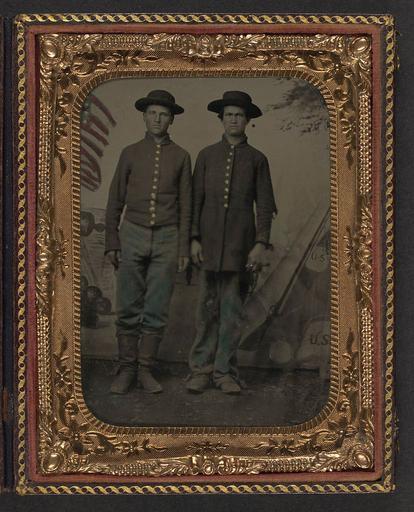 Keywords: library of congress libraryofcongress dc:identifier=http://hdl.loc.gov/loc.pnp/ppmsca.27139 dc:identifier=httphdllocgovlocpnpppmsca27139 xmlns:dc=http://purl.org/dc/elements/1.1/ xmlns:dc=httppurlorgdcelements11 groupshot people photo border picture frame [Two unidentified young soldiers in Union uniforms in front of painted backdrop showing military camp] [between 1861 and 1865] 1 photograph : quarter-plate tintype, hand-colored ; 11.7 x 9.4 cm (case) Notes: Title devised by Library staff. Case: Leather geometric design with ornate embelishments. Gift; Tom Liljenquist; 2010; (DLC/PP-2010:105). Subjects: United States.--Army--People--1860-1870. Soldiers--Union--1860-1870. Military uniforms--Union--1860-1870. Backdrops--1860-1870. Youth--1860-1870. United States--History--Civil War, 1861-1865--Military personnel--Union. Format: Group portraits--1860-1870. Portrait photographs--1860-1870. Tintypes--1860-1870. Rights Info: No known restrictions on publication. Repository: Library of Congress, Prints and Photographs Division, Washington, D.C. 20540 USA, hdl.loc.gov/loc.pnp/pp.print Part Of: Ambrotype/Tintype filing series (Library of Congress) (DLC) 2010650518 Liljenquist Family collection (Library of Congress) (DLC) 2010650519 More information about this collection is available at hdl.loc.gov/loc.pnp/pp.lilj Persistent URL: hdl.loc.gov/loc.pnp/ppmsca.27139 Call Number: AMB/TIN no. 2286 [Two unidentified young soldiers in Union uniforms in front of painted backdrop showing military camp] [between 1861 and 1865] 1 photograph : quarter-plate tintype, hand-colored ; 11.7 x 9.4 cm (case) Notes: Title devised by Library staff. Case: Leather geometric design with ornate embelishments. Gift; Tom Liljenquist; 2010; (DLC/PP-2010:105). Subjects: United States.--Army--People--1860-1870. Soldiers--Union--1860-1870. Military uniforms--Union--1860-1870. Backdrops--1860-1870. Youth--1860-1870. United States--History--Civil War, 1861-1865--Military personnel--Union. Format: Group portraits--1860-1870. Portrait photographs--1860-1870. Tintypes--1860-1870. Rights Info: No known restrictions on publication. Repository: Library of Congress, Prints and Photographs Division, Washington, D.C. 20540 USA, hdl.loc.gov/loc.pnp/pp.print Part Of: Ambrotype/Tintype filing series (Library of Congress) (DLC) 2010650518 Liljenquist Family collection (Library of Congress) (DLC) 2010650519 More information about this collection is available at hdl.loc.gov/loc.pnp/pp.lilj Persistent URL: hdl.loc.gov/loc.pnp/ppmsca.27139 Call Number: AMB/TIN no. 2286 |