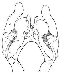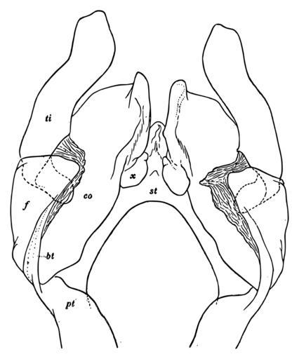 | Keywords: Tylobolus uncigerus anterior gonopods a.svg fr Tylobolus uncigerus Wood ” Gonopodes antérieurs face postérieure st lame ventrale; co coxoïde; f fémoroïde; ti tibia-tarse; pt poche trachéenne; bt bride trachéenne; x sclérite basal en Tylobolus uncigerus Wood Anterior gonopods posterior aspect st sternite; co coxite; f femorite; ti tibia-tarsus; pt tracheal pocket; bt tracheal flange; x basal sclerite 1914 Brolemann H W 1914 http //www biodiversitylibrary org/page/32074718 page/9/mode/1up Etude sur les Spribolides Myriapodes Annales de la Société entomologique de France Vol 83 pp 1-38 Henri Wilfred Brolemann 1860 - 1933 other versions PD-old-70-1923 Tylobolus uncigerus Gonopods Uploaded with UploadWizard |