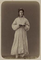 | Keywords: Types of Nationalities in the Turkestan Krai. Jews. Sheivamu (Mulla Suleiman) WDL11030.png Artwork ru Кун Александ Людвигович 1840 1888 гг fr Kun Aleksandr L 1840-1888 en Kun Aleksandr L 1840-1888 zh 亚历山大·L· ,1840-1888 年 pt Kun Aleksandr L 1840-1888 ar كُن، ألكسندر ل ، 1840-1888 es Kun Aleksandr L 1840-1888 ru Типы на одностей Ту кестанского к ая Ев еи Шейваму улла Сулейман fr Types de nationalités dans le kraï du Turkestan Juifs Sheivamu Mulla Suleiman en Types of Nationalities in the Turkestan Krai Jews Sheivamu Mulla Suleiman zh 其斯 边疆区民族类型 犹太人 舍伊瓦穆(穆拉 苏莱曼) pt Tipos de nacionalidades na krai do Turquestão Judeus Sheivamu Mulla Suleiman ar أنواع الجنسيات في إقليم تُرْكِستان اليهود شيفامو مُلّا سليمان ru Эта фотог афия входит в этног афическую часть Ту кестанского альбома всесто оннего исследования Цент альной Азии п едп инятого после того как в 1860-х годах в егионе установилось господство Российской импе ии Альбом созданный по аспо яжению гене ала Константина Пет овича фон Кауфмана 1818-1882 гг пе вого гене ал-губе нато а оссийского Ту кестана состоит из четы ех частей в шести томах Часть а хеологическая два тома Часть этног афическая два тома Часть п омысловая один том и Часть исто ическая один том Основным составителем альбома был усский востоковед Александ Людвигович Кун аботавший совместно с иколаем Венедиктовичем Богаевским В альбоме п едставлено около 1200 фотог афий а также а хитекту ные планы аква ельные исунки и ка ты Часть этног афическая включает 491 отдельную фотог афию на 163 листах а фотог афиях изоб ажены п едставители азличных на одов егиона листы 1-33 повседневная жизнь и итуалы листы 34-91 а также виды де евень и го одов уличные то говцы и комме ческая деятельность листы 92-163 <br>Одежда и платье; Этног афические фотог афии; Шляпы; Головные убо ы; Ев еи; ужчины; Фотог афические исследования; По т етные фотог афии; По т еты fr Cette photographie est extraite de la partie ethnographique de l'<em>Album du Turkestan</em> étude visuelle complète de l'Asie centrale entreprise après que l'Empire russe prit le contrôle de la région dans les années 1860 Commandé par le général Konstantin Petrovich von Kaufman 1818 1882 premier gouverneur général du Turkestan russe l'album est composé de six volumes répartis en quatre parties la partie archéologique deux volumes la partie ethnologique deux volumes la partie sur les métiers un volume et la partie historique un volume L'album fut essentiellement compilé par l'orientaliste russe Aleksandr L Kun assisté de Nikolai V Bogaevskii Il comporte près de 1 200 photographies et inclut également des plans architecturaux des dessins à l'aquarelle et des cartes La partie ethnographique compte 491 photographies sur 163 planches montrant des individus des différentes peuplades de la région planches 1 à 33 des scènes de la vie quotidienne et des rites planches 34 à 91 ainsi que des vues de villages et de villes de vendeurs ambulants et d'activités commerciales planches 92 à 163 <br>Vêtements et habits; Photographies ethnographiques; Chapeaux; Coiffures; Juifs; Hommes; Inventaires photographiques; Portraits photographiques; Portraits en This photograph is from the ethnographical part of <em>Turkestan Album</em><em> </em>a comprehensive visual survey of Central Asia undertaken after imperial Russia assumed control of the region in the 1860s Commissioned by General Konstantin Petrovich von Kaufman 1818 82 the first governor-general of Russian Turkestan the album is in four parts spanning six volumes Archaeological Part two volumes ; Ethnographic Part two volumes ; Trades Part one volume ; and Historical Part one volume The principal compiler was Russian Orientalist Aleksandr L Kun who was assisted by Nikolai V Bogaevskii The album contains some 1 200 photographs along with architectural plans watercolor drawings and maps The Ethnographic Part includes 491 individual photographs on 163 plates The photographs show individuals representing the different peoples of the region Plates 1 33 ; daily life and rituals Plates 34 91 ; and views of villages and cities street vendors and commercial activities Plates 92 163 <br>Clothing and dress; Ethnographic photographs; Hats; Headgear; Jews; Men; Photographic surveys; Portrait photographs; Portraits zh 这张照片出自<em> 其斯 相册 </em><em></em>的民族部分,该相册是俄罗斯 国 19 世纪 60 年代取得中亚控制 后, 手制 的 部针对该 区的综合 图像调查记录 相册由俄罗斯驻 其斯 (俄罗斯 国中亚属 的名称)首任 康斯 丁·彼得罗维奇·凡· 夫曼(Konstantin Petrovich von Kaufman,1818 82 年)将军赞助完成,共分六卷,四个部分: 古部分 (两卷); 民族部分 (两卷); 贸易部分 ( 卷)和 历史部分 ( 卷) 相册的主要编纂人是俄罗斯 方学 亚历山大·L· Aleksandr L Kun ,并由尼可莱·V·柏