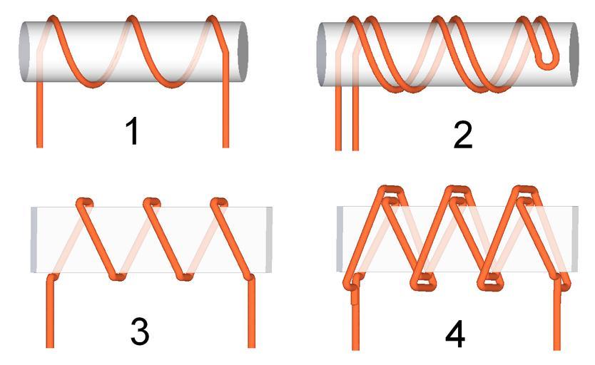 | Keywords: Types of winding by Zureks.png en Types of winding used in wire resistors 1 - simple inductive 2 - bifilar low inductance 3 - simple on a flat former inductance reduced due to small cross-section area 4 - Ayrton-Perry winding on a flat former the wire is split and wound around the former in opposite directions pl Rodzaje uzwojeń używane w rezystorach drutowych 1 - zwykłe nawinięcie powodujące indukcyjność rezystora 2 - uzwojenie bifilarne o małej indukcyjności 3 - zwykłe uzwojenie na płaskim elemencie indukcyjność o małej wartości z uwagi na mniejszy przekrój cewki 4 - uzwojenie Ayrtona-Perry'ego na płaskim elemencie składa się z dwóch drutów nawiniętych przeciwsobnie i połączonych przy wyprowadzeniach own Zureks 2009 thumb left Ayrton-Perry winding Resistor schemas |