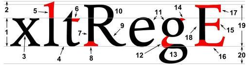 | Keywords: Typoghaphia.svg parti tipografiche dei caratteri <br>1 - occhio medio od altezza si misura sempre sulla x <br>2 - altezza massima<br>3 - apice<br>4 - linea di base<br>5 - ascendente<br>6 - incrocio<br>7 - asta verticale<br>8 - grazia<br>9 - gamba<br>10 - occhiello<br>11 - spaziatura<br>12 - collo<br>13 - occhiello<br>14 - orecchio<br>15 - cravatta<br>16 - asta orizzontale<br>17 - braccio<br>18 - asta verticale<br>19 - altezza della maiuscola<br>20 - dicendente typographic parts of a glyph <br>1 - x-height <br>2 - ascender line<br>3 - apex<br>4 - baseline<br>5 - ascender<br>6 - crossbar<br>7 - stem<br>8 - serif<br>9 - leg<br>10 - bowl<br>11 - counter<br>12 - collar<br>13 - loop<br>14 - ear<br>15 - tie<br>16 - horizontal bar<br>17 - arm<br>18 - vertical bar<br>19 - cap height<br>20 - descender line 2006-11-16 F l a n k e r typographic font designed by myself named Imperator Examples of typography terms Typographia.svg parti tipografiche dei caratteri <br>1 - occhio medio od altezza si misura sempre sulla x <br>2 - altezza massima<br>3 - apice<br>4 - linea di base<br>5 - ascendente<br>6 - incrocio<br>7 - asta verticale<br>8 - grazia<br>9 - gamba<br>10 - occhiello<br>11 - spaziatura<br>12 - collo<br>13 - occhiello<br>14 - orecchio<br>15 - cravatta<br>16 - asta orizzontale<br>17 - braccio<br>18 - asta verticale<br>19 - altezza della maiuscola<br>20 - dicendente typographic parts of a glyph <br>1 - x-height <br>2 - ascender line<br>3 - apex<br>4 - baseline<br>5 - ascender<br>6 - crossbar<br>7 - stem<br>8 - serif<br>9 - leg<br>10 - bowl<br>11 - counter<br>12 - collar<br>13 - loop<br>14 - ear<br>15 - tie<br>16 - horizontal bar<br>17 - arm<br>18 - vertical bar<br>19 - cap height<br>20 - descender line typographische Teile einer Glyphe <br>1 - Mittellänge x-Höhe <br>2 - Oberlinie k-Linie<br>3 - Apex <br>4 - Grundlinie<br>5 - Oberlänge<br>6 - Querstrich <br>7 - Stamm Hasta<br>8 - Serife<br>9 - Bein<br>10 - <br>11 - Punze<br>12 - Steg<br>13 - Schleife<br>14 - Ohr<br>15 - <br>16 - <br>17 - Arm <br>18 - <br>19 - Versalhöhe<br>20 - Unterlänge 2006-11-16 F l a n k e r typographic font designed by myself named Imperator Examples of typography terms |