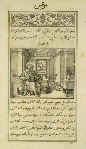 | Keywords: Typographia Medicea 1590 Marcus.jpg Arabic translation of Gospel of Mark in Euangelium sanctum Domini Nostri Iesu Christi conscriptum a quatuor euangelistis sanctis idest Mattheo Marco Luca et Iohanne Romae in Typographia Medicea 1590- 1591 Source http //www ibiblio org/expo/vatican exhibit/exhibit/h-orient_to_rome/images/orient13 jpg First line is بسم الآب والابن والروح القدس الإله الواحد see en List of Christian terms in Arabic PD-old 1590 Arabic texts Gospel of Mark | ||||