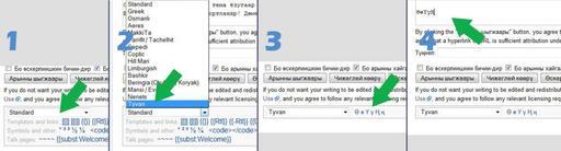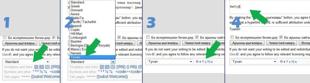 Keywords: Tyvan-edittools.png en Four panel screenshot showing how to insert Tyvan letters when editing on Incubator 2012-06-16 own Sborsody cc-zero Uploaded with UploadWizard Tuvan Wikipedia T