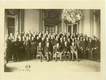 | Keywords: france peace u.s. commission to negotiate peace uscommissiontonegotiatepeace monochrome Local Accession Number: 259 Description: The full personnel of the American Commission taken at their headquarters, Hotel Crillon, Paris, just before the signing of peace. In the front row, from left to right, are: Col. E. M. House, Robert Lansing, President Wilson, Henry White, General Tasker H. Bliss. Photographer: Underwood and Underwood Source: Research Library, 20th Century Fox Size: 8x10,8.5x6.5 Medium: Print, Black and White Date:1919 Local Accession Number: 259 Description: The full personnel of the American Commission taken at their headquarters, Hotel Crillon, Paris, just before the signing of peace. In the front row, from left to right, are: Col. E. M. House, Robert Lansing, President Wilson, Henry White, General Tasker H. Bliss. Photographer: Underwood and Underwood Source: Research Library, 20th Century Fox Size: 8x10,8.5x6.5 Medium: Print, Black and White Date:1919 |