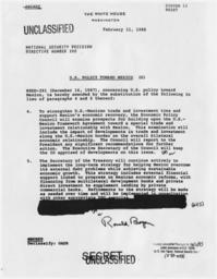 | Keywords: U.S. Policy Toward Mexico - NARA - 198392.jpg Scope and content General notes 198392 Local identifier President 1981-1989 Reagan National Security Council 1981 - 1989 Ronald Reagan Library NLRR 40 Presidential Drive Simi Valley CA 93065-0600 1988-02-11 Record group Collection RR-NSC Numbered National Security Policy Papers 1981 - 1989 Record group ARC 1189 National Security Decision Directives compiled 02/25/1981 - 01/19/1989 Series ARC 198166 File unit File unit ARC Variant control numbers NAIL Control Number NLS-NSC-NSDD-300 Other versions <gallery> File U S _Policy_Toward_Mexico_-_NARA_-_198392 tif tif File U S _Policy_Toward_Mexico_-_NARA_-_198392 jpg jpg </gallery> NARA-cooperation PD-USGov Presidential Decision Directives Reagan |