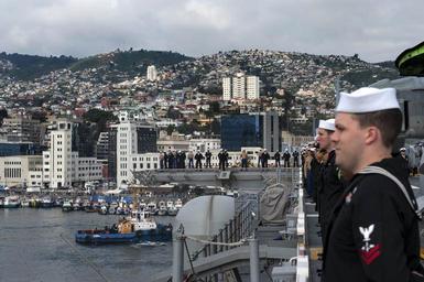 | Keywords: U.S. Sailors and Marines man the rails as the amphibious assault ship USS America (LHA 6) departs Valparaiso, Chile, Aug. 27, 2014, after a three-day port visit 140827-N-MZ309-052.jpg en U S Sailors and Marines man the rails as the amphibious assault ship USS America LHA 6 departs Valparaiso Chile Aug 27 2014 after a three-day port visit The newly commissioned amphibious assault ship USS America LHA 6 embarked on a mission to conduct training engagements with partner nations throughout the Americas before reporting to its new home port of San Diego The America was set to be ceremoniously commissioned Oct 11 2014 2014-08-27 MC2 Ryan Riley http //www defenseimagery mil/imageRetrieve action guid 3d5fafd073f167801c9f93991dac1f01a6f7140b t 2 Public domain photograph from defenseimagery mil http //www defenseimagery mil/imagery html guid 3d5fafd073f167801c9f93991dac1f01a6f7140b 140827-N-MZ309-052 2014-09-02 Valparaiso PD-USGov-Military-Navy Aboard USS America LHA-6 Images from DoD uploaded by Fæ Views of Valparaíso |