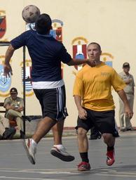 | Keywords: U.S. Southern Command Partnership of the Americas strategy DVIDS180328.jpg en A Peruvian naval surface forces sailor head butts a soccer ball during their match with Sailors from the the guided missile frigate USS Doyle FFG 39 during a multi-national soccer tournament on the Peruvian naval base Doyle is deployed as part Southern Seas 2009 a U S Southern Command Partnership of the Americas strategy and focuses on strengthening the relationship in the SOUTHCOM area of focus This years deployment includes the guided-missile frigates USS Doyle FFG 39 USS Kauffman FFG 59 and USS Ford FFG 54 with DESRON 40 as the command element 2009-06-12 Petty Officer 3rd Class Patrick Grieco https //www dvidshub net/image/180328 090612-N-+++++-757 2009-06-16 17 31 CALLAO PE PD-USGov-Military-Navy USS Ford FFG-54 Southern Seas 2009 Images from DoD uploaded by Fæ |