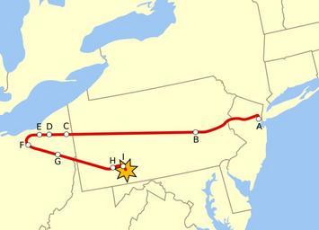 | Keywords: UA93 path.svg en Flight path of United Airlines Flight 93 on September 11 2001 Manually remade in Inkscape by Mysid after Image 911 commission UA93 path png Mysid<br/>Original by the 9/11 commission 2008-07-20 United Airlines Flight 93 Maps and diagrams of 9/11 |