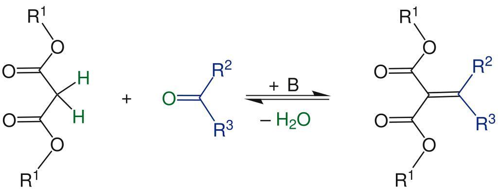 Keywords: Übersicht Knoevenagel-Reaktion V2.svg Structure of Struktur von Own 2012-08-14 Eva1900 <span class signature-talk >talk</span> PD-chem Cc-zero Knoevenagel condensation