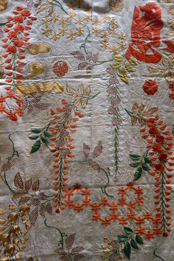 Keywords: Uchikake (garment with long hanging sleeves), view 2, Edo period, 18th century, hexagonal pattern, wisteria, and character design on white figured satin ground - Tokyo National Museum - DSC06011.JPG en Exhibit in the Tokyo National Museum Tokyo Japan This artwork is old enough so that it is in the public domain 2013-09-03 00 27 06 own Daderot cc-zero Uchikake in the Tokyo National Museum Uploaded with UploadWizard |