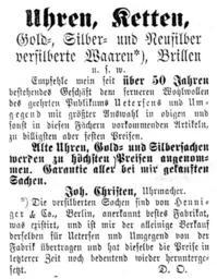 | Keywords: Uetersen Anzeige Joh. Christen Uhrmacher 1886.jpg de Zeitungsanzeige des Uetersener Uhrmachers Joh Christen im Uetersener Tageblatt vom 23 Dezember 1886 eigene reproduktion das Original mehr als 70 Jahre alt own reproduktion original is more than 70 years old author 1886 PD-old Documents of Uetersen Clockmakers in advertising |