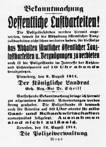 | Keywords: Uetersen Bekanntmachung Oeffentliche Lustbarkeiten Aug. 1914.jpg de Bekanntmachung Tanzverbot in den Uetersener Nachrichten 1914 eigene reproduktion das Original mehr als 70 Jahre alt own reproduktion original is more than 70 years old Author 1914 Germany in World War I Documents of Uetersen World War I PD-old |