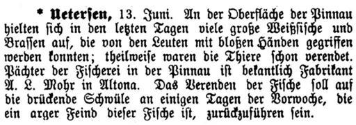 | Keywords: Uetersen Bekanntmachung Pinnau 1899.jpg de Bekanntmachung über ein Fischsterben in der Pinnau vermutlich durch starke Schwüle im Juni 1899 im Uetersener Tageblatt vom 15 Juni 1899 eigene reproduktion das Original mehr als 100 Jahre alt own reproduktion original is more than 100 years old Author 1899-06-15 Pinnau Documents of Uetersen PD-old |