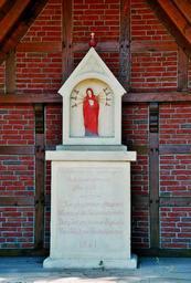 | Keywords: Uffeln Betstock Nordbahnstrasse 3.jpg en Wayside shrine Our Lady of the Seven Sorrows Nordbahnstraße in Ibbenbüren-Uffeln Kreis Steinfurt North Rhine-Westphalia Germany It is a listed cultural heritage monument de Betstock an der Nordbahnstraße in Ibbenbüren-Uffeln Kreis Steinfurt Nordrhein-Westfalen Deutschland Der in einem kleinen Fachwerk-Bethäuschen untergebrachte Bildstock befindet sich direkt hinter dem Gleis der Tecklenburger Nordbahn vor dem Gelände des Landgasthofes Mutter Bahr und wird von der Familie Bahr gepflegt und instandgehalten Die Inschriften H Bahr 1 5 1839 und Thers Huntemann 1 5 1839 weisen auf die Stifter hin Daher wird der Betstock auf das Jahr 1839 datiert obwohl im Sockel die Jahreszahl 1861 eingehauen ist Der Sockel aus Sandstein enthält zudem die Inschriften Ein Schwert wird deine eigene/ Seele durchdringen oben und darunter O Jungfrau weinend flehen wir/ wenn einst der Tod uns ruft von hier/ bring Trost uns dann in Angst und Not/ und Hilfe wo Verderben droht Der Aufsatz des Bildstocks zeigt eine Mater-dolorosa-Darstellung Die sieben Schmerzen Mariens Das žObjekt der Volksfrömmigkeit steht seit 1985 komplett unter Denkmalschutz Ibbenbüren A 022 own J -H Janßen 2012-05-26 Betstock žDie sieben Schmerzen Mariens Uffeln Timber framing in Ibbenbüren German inscriptions in Germany Ibbenburen-Uffeln 2012 in Ibbenbüren 20120526 Ibbenburen-Uffeln May 2012 in Germany 20120526 Ibbenburen-Uffeln Bilder von J -H Janßen Cc-zero |