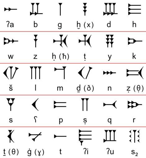 | Keywords: Ugaritic Chart of Letters.svg from File Ugaritic-alphabet-chart svg follows A table of the letters of the Ugaritic cuneiform alphabet with corresponding conventional Latin-alphabet transcriptions Where such specialist Semitological symbols are somewhat divergent from more widely-understood general linguistic IPA symbols an equivalent IPA symbol follows in parentheses except that no attempt is made to interpret underdots for emphatic consonants in terms of IPA; note that the use of IPA symbols is not intended to be any kind of exact phonetic reconstruction of details of ancient Ugaritic pronunciation The symbols y and š which are Americanist as well as Semitological do not have their IPA equivalents j and ʃ listed in the chart <br><br> The letters ṭ ṣ ẓ q wrote sounds which were the emphatic counterparts to non-emphatic t s θ k but it is not known what the exact phonetic nature of such emphasis contrasts was in ancient Ugaritic Certain confusions or semi-coalescences of letters such as between ẓ and ġ etc hint at sound changes within Ugaritic <br><br> The vertical red line in the last row of the table divides the basic 27 Ugaritic letters presumably adapted from an early non-Cuneiform alphabet from the last three letters which seem to have been added within Ugaritic originally to transcribe foreign words or languages REMOVED IN THIS VERSION OF GRAPHIC<br><br> The only punctuation was a word divider a short vertical stroke not shown in the table <br><br> Note that some of the character names included in the Unicode standard listing at http //www unicode org/charts/PDF/U10380 pdf seem to be rather speculative and hypothetical while other names are strangely and anachronistically taken from the Greek alphabet etc These Unicode character names are not useful for linguistic or philological research <br><br> This is a self-made graphic based on fonts and publicly-available information declared to be in the public domain <br><br> For a version of this chart with Arabic equivalents to Ugaritic letters see File Ugaritic-alphabet-chart-Arabic svg For a chart with somewhat different letter-shapes since based on a more tapering wedge and including the word-divider see File Ugaritic script sample svg Ugaritic-alphabet-chart svg User AnonMoos AnonMoos 2012-03 Alphabet charts Ugaritic letters |