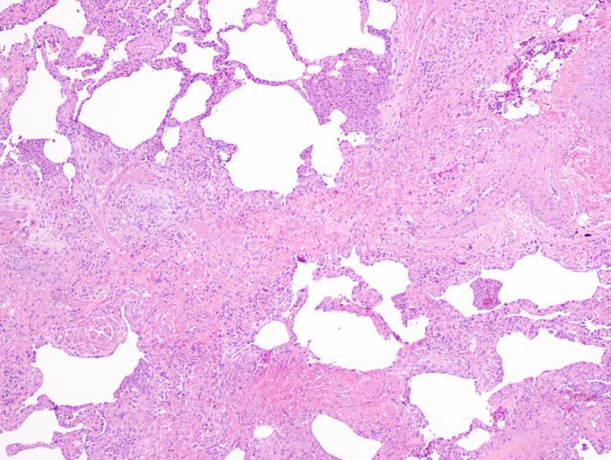 | Keywords: UIPlungbiopsy.jpg en Appearance of usual interstitial pneumonia UIP in a surgical lung biopsy at low magnification The tissue is stained with hematoxylin purple dye and eosin pink dye to make it visible The pink areas in this picture represent lung fibrosis Note the patchwork quilt-like pattern of the fibrosis own Mutleysmith 2009-11-29 Histopathology of the usual interstitial pneumonia Biopsy | ||||
