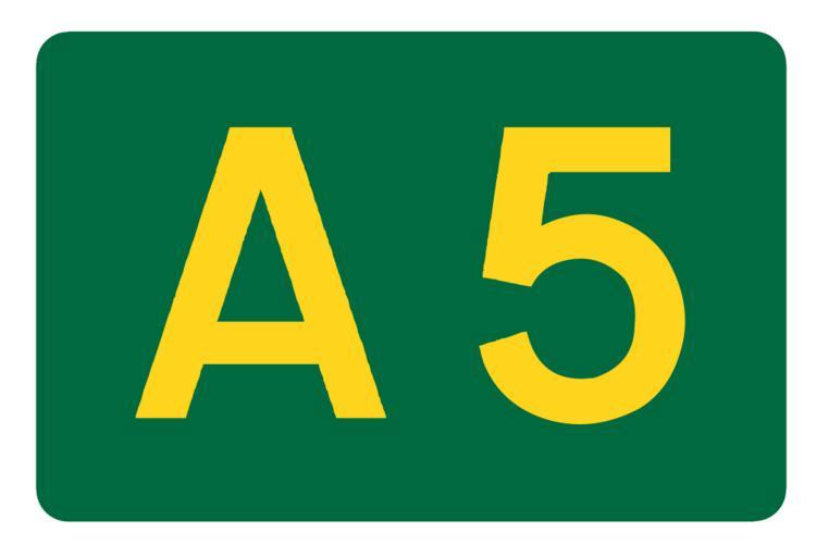 Keywords: UK road A5.svg en UK A5 road sign own Mauls 2009-01 Diagrams of route signs of the United Kingdom A5 road Great Britain 5 number