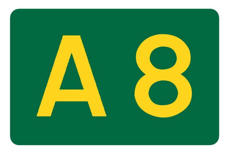 Keywords: UK road A8.svg en UK road number patch A8 own Mauls 2009-01 Diagrams of route signs of the United Kingdom 8 number