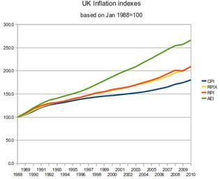 | Keywords: UKinflation.png Retail Price Index RPI the RPI excluding mortages RPIX and the Consumer Price Index CPI It also includes for comparison the Average Earnings Index AEI These are derived from the http //www statistics gov uk Office for National Statistics reduced to a common base of January 1988 100 own Chris55 Cc-zero Check categories 2011 April 25 en wikipedia Retail_Price_Index en wikipedia Consumer_Price_Index_ United_Kingdom 6 1947 establishments Economy of the United Kingdom National statistical services Inflation graphs Demographic charts of the United Kingdom Organizations established in 1996 |