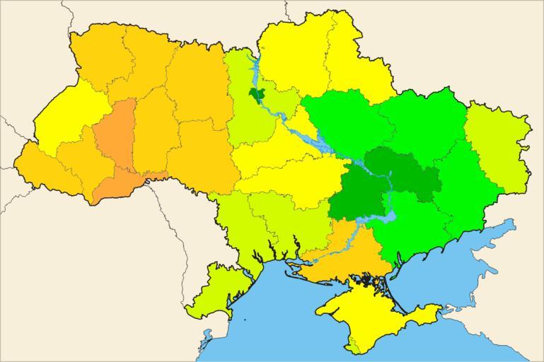 | Keywords: Ukraine GRP per capita 2008 US dollars (nominal).png en Ukraine GRP per capita 2008 US dollars ru ВРП егионов Ук аины на душу населения 2008 в долла ах США de BRP Bruttoregionalprodukt per capita pro Kopf in der Ukraine 2008 in US nominal 008000; more than 10000 Kyiv City 00BA00; 5000 - 10000 Dnipropetrovsk Oblast 00F900; 4000 - 5000 Donetsk Oblast Zaporizhia Oblast Poltava Oblast Kharkiv Oblast D3FB00; 3000 - 4000 Kiev Oblast Odessa Oblast Luhansk Oblast Mykolaiv Oblast; Sevastopol City FFFC00; 2500 - 3000 Cherkasy Oblast Lviv Oblast Sumy Oblast Kirovohrad Oblast Chernihiv Oblast; Autonomous Republic of Crimea FFD20E; 2000 - 2500 Ivano-Frankivsk Oblast Volyn Oblast Rivne Oblast Vinnytsia Oblast Kherson Oblast Khmelnytskyi Oblast Zhytomyr Oblast Zakarpattia Oblast FFAA37; less than 2000 Chernivtsi Oblast Ternopil Oblast wikipedia Creator Emilfaro 2008-09-11 Cc-zero Check categories 2010 December 22 ru wikipedia Список_ егионов_Ук аины_по_ВРП_на_душу_населения Economy of Ukraine 2 Economic maps of Ukraine |