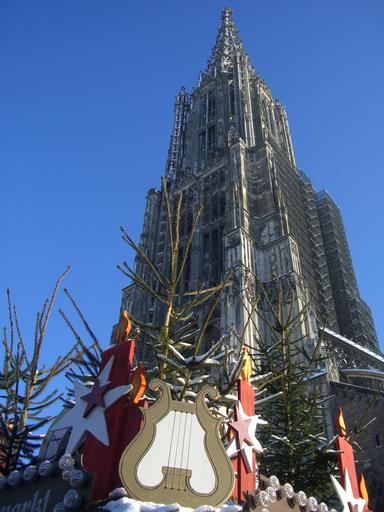 Keywords: ulm cathedral gothic highest church tower sky blue christmas market