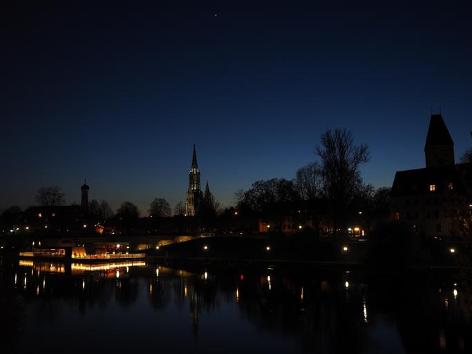 Keywords: ulm danube at night evening mood river water münster lights bank boot bank of the danube night sky venus star romantic ulm cathedral ship restaurant ship restaurant boat house restaurant ship boathouse ulm dark