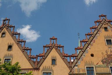 Keywords: ulm town hall facade yellow painting ulmer hall frescoes monument early renaissance secco painting mural coat of arms gable