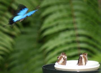 Keywords: Ulysses Flying over Feeder, Kuranda Butterfly Santuary.jpg Ulysses Flying over Feeder Kuranda Butterfly Sanctuary Own Lepidlizard Insects in flight Australian Butterfly Sanctuary Papilio ulysses