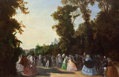 | Keywords: Uma vista do Passeio Público (1856) - Leonel Marques Pereira.png en A view of the Passeio Público 1856 by Leonel Marques Pereira The painter depicted a group of elegant characters assembled in two rows walking through the Passeio Público park in Lisbon Portugal The group is the center of the composition and is arranged in what seems to be an elongated V shape that heightens the perspective In the center of the group the figure of King Ferdinand II stands out from the others tall lean and elegant wearing a brown morning coat white trousers and a tall hat Next to the central character wearing military uniform the King's aide-de-camp the Count of Campanhã; the other two male figures around these central characters are Almeida Garrett and the Marquis of Ávila e Bolama All of the figures are surrounded by a thoroughly green environment that reminds the country depictions of Watteau The King greets the ladies and the assembled gentlemen uncover their heads their greeting being elegantly returned The gentlemen are also in morning dress top hats and tight trousers The ladies wear a set of colourful dresses and ample skirts over petticoats and crinolines Capes hats and parasols are natural complements of the toilette The surrounding natural environment was treated by the artist with large detail be that in colour or shape which allows us to identity some species of the trees such as a banana-tree on the left side of the observer and the willows in the background Also in the background one can glimpse the ruins of the Carmo Convent and the buildings around the Rossio Square pt Uma vista do Passeio Público 1856 por Leonel Marques Pereira O pintor representou um conjunto de personagens galantes alinhadas em duas fileiras que passeiam nesse espaço rodeado de densa vegetação O grupo centraliza a composição e dispõe-se numa espécie de V alargado o que constitui um efeito de acentuação da perspectiva Nesse grupo destaca-se ao centro a figura do rei D Fernando II alto esguio e elegante trajando fraque castanho calças brancas e chapéu alto Junto à personagem central e trajando uniforme militar o seu ajudante de campo o conde de Campanhã sendo as outras duas figuras masculinas que compõem este núcleo central Almeida Garrett e o Marquês de Ávila e Bolama Todo o conjunto de figuras representadas se encontra enquadrado por um ambiente densamente natural que faz lembrar as representações campestres de Watteau O rei cumprimenta as damas e os cavalheiros presentes descobrindo a cabeça sendo correspondido da forma elegante nesses cumprimentos Os cavalheiros apresentam-se também de fraque cartola e elegantes calças justas As damas surgem representadas com um conjunto de coloridos trajes e amplas saias que fazem adivinhar por baixo os saiotes e as crinolinas em oposição aos corpetes justos e decotados As capas os chapéus e as sombrinhas constituem o natural complemento de toilette A envolvencia vegetal foi tratada pelo pintor com enorme detalhe quer cromático quer de traço motivo pelo qual é possível identificar algumas espécies de árvores diferentes tal como a bananeira do lado esquerdo do observador e os chorões ao fundo Também ao fundo num plano alteado semi-encoberto pela vegetação são visíveis as ruínas do Convento do Carmo e o casario do Rossio 1856 http //www parquesdesintra pt/pontos-de-atracao/colecao-de-pintura/ Parques de Sintra - Monte da Lua Leonel Marques Pereira 1828-1892 other versions PD-old-100 1856 paintings 1856 in Lisbon Fashion in 1856 19th-century paintings from Portugal 19th-century paintings in Portugal Ferdinand II of Portugal Passeio Público Lisbon Uploaded with UploadWizard Almeida Garrett |