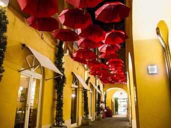 Keywords: umbrellas street stores shops restaurant alley