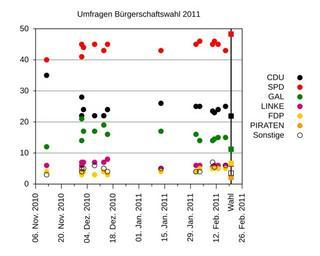 | Keywords: UmfrageHH2011.svg Gnuplot created SVG file of the poll history of the Hamburg election 2011 own MyName Sig11 <span class signature-talk >talk</span> Source code gnuplot <pre> Ausgabedatei und -format set output 'UmfrageHH2011 svg' set terminal svg Datumformat set locale 'de_DE UTF-8' set xdata time set timefmt d m Y set format x d b Y Titel set title 'Umfragen Bürgerschaftswahl 2011' Achsen und Gitternetz unset xlabel set xtics out nomirror rotate 1 autofreq scale 1 0 5 set ytics out nomirror scale 0 5 set grid ytics set yrange 0 50 Legende set key outside right center set label Wahl at '20 02 2011' -3 right rotate by 90 Plotten plot 'hh11 dat' using 1 2 lt -1 pt 7 title 'CDU' \ 'hh11 dat' using 1 3 lt 1 pt 7 title 'SPD' \ 'hh11 dat' using 1 4 lt 2 pt 7 title 'GAL' \ 'hh11 dat' using 1 5 lt 12 pt 7 title 'LINKE' \ 'hh11 dat' using 1 6 lt 11 pt 7 title 'FDP' \ '-' using '20 02 2011' 1 lt 7 pt 7 title 'PIRATEN' \ 'hh11 dat' using 1 7 lt -1 pt 6 title 'Sonstige' \ '-' using '20 02 2011' 1 with impulses lt -1 lw 2 notitle \ '-' using '20 02 2011' 1 lt -1 pt 5 notitle \ '-' using '20 02 2011' 1 lt 1 pt 5 notitle \ '-' using '20 02 2011' 1 lt 2 pt 5 notitle \ '-' using '20 02 2011' 1 lt 12 pt 5 notitle \ '-' using '20 02 2011' 1 lt 11 pt 5 notitle \ '-' using '20 02 2011' 1 lt 7 pt 5 notitle \ '-' using '20 02 2011' 1 lt -1 pt 4 notitle Dummy fuer die Erzeugung der Piraten in der Legende 70 e Dummy fuer die Erzeugung des Wahltermins 70 e Wahlergebnis CDU 21 9 e Wahlergebnis SPD 48 3 e Wahlergebnis GAL 11 2 e Wahlergebnis LINKE 6 4 e Wahlergebnis FDP 6 7 e Wahlergebnis PIRATEN 2 1 e Wahlergebnis Sonstige 3 5 e set output </pre> hh11 dat contains <pre> CDU SPD GAL LINKE FDP Sonstige 17 02 2011 25 43 15 6 5 6 13 02 2011 24 45 15 6 5 11 02 2011 23 46 14 5 6 5 5 5 10 02 2011 23 5 45 14 5 5 5 7 03 02 2011 25 46 14 6 5 4 01 02 2011 25 45 16 6 4 4 13 01 2011 26 43 17 5 4 5 15 12 2010 24 45 16 8 3 4 13 12 2010 22 43 19 7 4 5 08 12 2010 22 45 17 7 3 6 02 12 2010 24 44 17 7 4 5 01 12 2010 28 45 14 6 3 4 01 12 2010 22 41 21 7 4 5 12 11 2010 35 40 12 6 4 3 </pre> References http //www wahlrecht de/umfragen/landtage/hamburg htm Wahlrecht de for the poll results http //www statistik-nord de/wahlen/wahlen-in-hamburg/buergerschaftswahlen/2011/ Statistik Nord for the preliminary result of Feb 23 Specifically the file http //www statistik-nord de/uploads/tx_standocuments/INTBUEWA01 pdf INTBUEWA01 pdf Hamburgische Bürgerschaft election 2011 Umfragen |