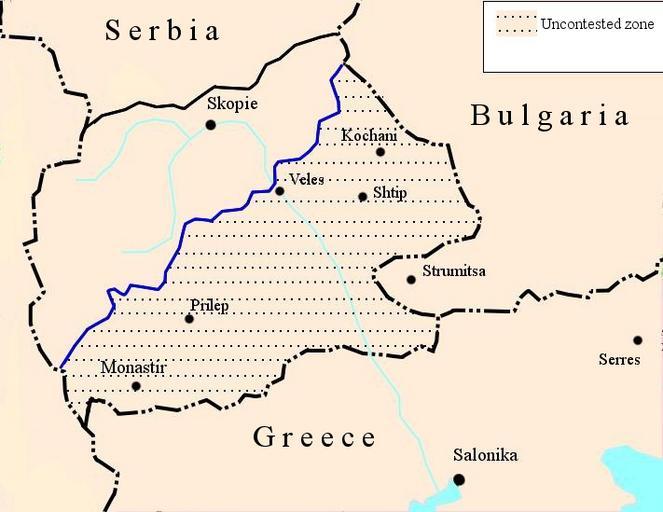 Keywords: Uncontested zone.JPG en The Uncontested and Contested zones in Vardar Macedonia as defined by the 1912 Treaty between Bulgaria and Serbia and later the Treaty of Bucharest 1913 bg Спо ната и Безспо ната зона в Ва да ска акедония съгласно догово а от 1912 Г аницата с Гъ ция е утвъ дена с Буку ещкият ми ен догово own Avidius 7 03 2011 DivisiónSerboBúlgaraDeMacedoniaEn1913 svg Cc-zero Maps showing 20th-century history |