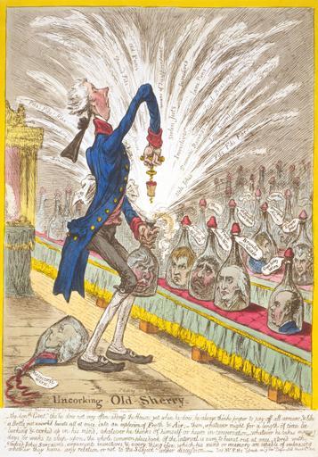 | Keywords: Uncorking-Old-Sherry-Gillray.jpeg Uncorking Old Sherry / Js Gillray inv fecit William Pitt stands in the House of Commons facing the opposition which is represented by bottles containing the heads of the most well-known opposition leaders including Fox Tierney Windham and Grey At Pitt's feet is a bottle containing the head of Sidmouth Pitt is uncorking a bottle containing the head of Sheridan the contents of which spray up and on which appear inscriptions describing excessive oratory apparently by the opposition This was one of the most popular of Gillray's political prints 1 print etching hand-colored Caption reads Published March 10 1805 by H Humphrey St James Street London the honble Gent tho' he does not very often address the House yet when he does he always thinks proper to pay off all arrears like a Bottle just uncorked bursts all at one into an explosion of Froth Air; ”then whatever might for a length of time lie lurking corked up in his mind whatever he thinks of himself or hears in conservation ” whatever he takes many days or weeks to sleep upon the whole commonplacebook of the interval is sure to burst out at once stored with studied-Jokes sarcasms arguments invectives every thing else which his mind or memory are capable of embracing whether they have any relation or not to the Subject under discussion - See Mr Ptts speech on y Gent Defence Bill March 6th 1805 Library of Congress Prints Photographs Division LC-USZC4-8783 color film copy transparency http //memory loc gov/master/pnp/cph/3g00000/3g08000/3g08700/3g08783u tif uncompressed archival TIFF version 49 MB cropped and converted to JPEG with the GIMP 2 4 5 image quality 88 1805-03-10 creator James Gillray No known restriction on publication LOC-image cph 3g08783 PD-old-100 James Gillray Sherry Wigs in art 1805 1805 cartoons Caricatures of William Pitt the Younger Richard Brinsley Sheridan 1800s political cartoons |