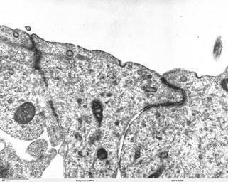 | Keywords: Unctional complex and pinocytotic vesicles - embryonic brain - TEM.jpg Transmission electron microscope image of a thin section cut through the developing brain tissue telencephalic hemisphere of an 11 5 day mouse embryo This image of the luminal surface of the telencephalon shows junctional complexes and pinocytotic vesicles The junctional complex is divided into three types of junctions 1 the most apical is the tight junction which controls and/or restricts the movement of molecules across epithelial layers and helps maintain polarity 2 the zonula adherens which also includes the numerous actin filaments seen in the apical cytoplasm and 3 the desmosome which is a spot junction The pinocytotic vesicles are formed from coated pits in the plasma membrane and are involved in endocytosis JEOL 100CX TEM References Marin-Padilla M 1985 Early Vascularization of the Embryonic Cerebral Cortex Golgi and Electron Microscope Studies J Comparative Neurology 241 237-249 Marin-Padilla M and M Amievo 1989 Early Neurogenesis of the Mouse Olfactory Nerve Golgi and Electron Microscope Studies J Comparative Neurology 288 339-352 http //remf dartmouth edu/imagesindex html http //remf dartmouth edu/images/mammalianBrainTEM/source/16 html Louisa Howard Miguel Marin-Padilla PD Louisa Howard Miguel Marin-Padilla Cell junctions Endocytosis Blood-brain barrier Transmission electron microscopic images |