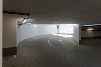 Keywords: underground car park concrete grey trist empty ground pattern cement columnar neon tube exit arrow center line