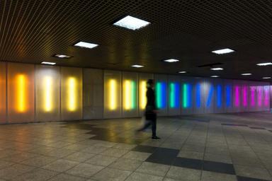 Keywords: underpass person woman neon lighting tile ground gradient yellow green cyan blue magenta pink wall tiling site underground railway station dark alone pedestrian human