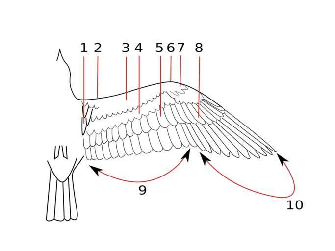 | Keywords: Underwing.svg Underwing of bird showing feather nomenclature Own 2007-04 L Shyamal 1 Axillaries 2 Margin Marginal underwing coverts 3 Lesser underwing coverts 4 Median underwing coverts Secondary coverts 5 Greater underwing coverts Secondary coverts 6 Carpal joint 7 Lesser underwing primary coverts 8 Greater undering primary coverts 9 Secondaries 10 Primaries Created with Inkscape Bird wing feather diagrams SVG bird anatomy | ||||