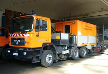 | Keywords: Unfallhilfsfahrzeug.Strab.MVG.JPG A M A N FE 460 heavy technical assistance shunting vehicle 460 hp diesel truck with crane and drawbar for pulling enrailing and shunting trams customized by Schörling Häuslingen Front view Prize 1 7 m ‚¬ Schweres Unfallhilfsfahrzeug der Münchener Verkehrsgesellschaft mit Dieselmotor 460 PS für Straßenbahnen mit Kran Das Zweiwegefahrzeug ist eine Sonderanfertigung von Schörling Fahrzeugbau Häuslingen GmbH Der Kaufpreis betrug nach Angaben der MVG Verkehrsmeister 1 7 Mio ‚¬ Beachte Separate Führerstände für den Betrieb im Schienen- bzw im Straßenverkehr sowie das weiße Dachlicht für den Schienenverkehr Dreilicht-Spitzensignal Das Fahrzeug ist im Schienenbetrieb im Gegensatz zu den meisten anderen vergleichbaren Fahrzeugtypen mit einem Treibradpaar statt einem Laufradpaar versehen sodaß der Antrieb im Schienenverkehr über das Gummilaufrad Straße nicht Schienen angetrieben wird Ansicht von schräg vorn User Mattes own 2006-04-16 <gallery> Image Unfallhilfswagen-Strab Frontal JPG Image UHF Strab Nahaufnahme JPG </gallery> MAN FE 460 A Road-rail vehicles in Germany Schörling-Brock Münchner Verkehrsgesellschaft Unfallhilfswagen Vehicles with blue and orange emergency lightbars Taken with Panasonic Lumix DMC-LC50 Work by Mattes 2006 User Mattes/Contributions/Topics/Transport User Mattes/Contributions/Topics/Germany/München Orange trucks Tram servicing ImageNote 1 945 852 342 277 1916 1314 2 200px ImageNoteEnd 1 |