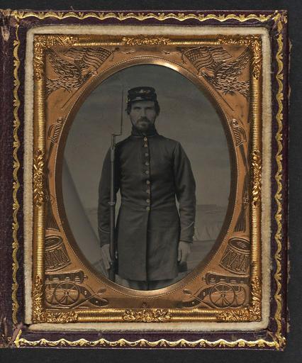 | Keywords: library of congress libraryofcongress dc:identifier=http://hdl.loc.gov/loc.pnp/ppmsca.27357 dc:identifier=httphdllocgovlocpnpppmsca27357 xmlns:dc=http://purl.org/dc/elements/1.1/ xmlns:dc=httppurlorgdcelements11 u.s. civil war uscivilwar american civil war americancivilwar the civil war thecivilwar civil war civilwar war between the states warbetweenthestates united states of america unitedstatesofamerica u.s.a. usa the union theunion union the north thenorth yankee yankees soldier gun musket people photo border picture frame round [Unidentified soldier in Union uniform with bayoneted musket in front of painted backdrop showing military camp] [between 1861 and 1865] 1 photograph : ninth-plate tintype, hand-colored ; 7.5 x 6.1 cm (case) Notes: Title devised by Library staff. Case: Plain with clasp. Gift; Tom Liljenquist; 2010; (DLC/PP-2010:105). Subjects: United States.--Army--People--1860-1870. Soldiers--Union--1860-1870. Military uniforms--Union--1860-1870. Rifles--1860-1870. Bayonets--1860-1870. Backdrops--1860-1870. United States--History--Civil War, 1861-1865--Military personnel--Union. Format: Portrait photographs--1860-1870. Tintypes--Hand-colored--1860-1870. Rights Info: No known restrictions on publication. Repository: Library of Congress, Prints and Photographs Division, Washington, D.C. 20540 USA, hdl.loc.gov/loc.pnp/pp.print Part Of: Ambrotype/Tintype filing series (Library of Congress) (DLC) 2010650518 Liljenquist Family collection (Library of Congress) (DLC) 2010650519 More information about this collection is available at hdl.loc.gov/loc.pnp/pp.lilj Persistent URL: hdl.loc.gov/loc.pnp/ppmsca.27357 Call Number: AMB/TIN no. 2492 [Unidentified soldier in Union uniform with bayoneted musket in front of painted backdrop showing military camp] [between 1861 and 1865] 1 photograph : ninth-plate tintype, hand-colored ; 7.5 x 6.1 cm (case) Notes: Title devised by Library staff. Case: Plain with clasp. Gift; Tom Liljenquist; 2010; (DLC/PP-2010:105). Subjects: United States.--Army--People--1860-1870. Soldiers--Union--1860-1870. Military uniforms--Union--1860-1870. Rifles--1860-1870. Bayonets--1860-1870. Backdrops--1860-1870. United States--History--Civil War, 1861-1865--Military personnel--Union. Format: Portrait photographs--1860-1870. Tintypes--Hand-colored--1860-1870. Rights Info: No known restrictions on publication. Repository: Library of Congress, Prints and Photographs Division, Washington, D.C. 20540 USA, hdl.loc.gov/loc.pnp/pp.print Part Of: Ambrotype/Tintype filing series (Library of Congress) (DLC) 2010650518 Liljenquist Family collection (Library of Congress) (DLC) 2010650519 More information about this collection is available at hdl.loc.gov/loc.pnp/pp.lilj Persistent URL: hdl.loc.gov/loc.pnp/ppmsca.27357 Call Number: AMB/TIN no. 2492 |