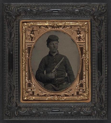| Keywords: library of congress libraryofcongress dc:identifier=http://hdl.loc.gov/loc.pnp/ppmsca.27514 dc:identifier=httphdllocgovlocpnpppmsca27514 xmlns:dc=http://purl.org/dc/elements/1.1/ xmlns:dc=httppurlorgdcelements11 u.s. civil war uscivilwar american civil war americancivilwar the civil war thecivilwar civil war civilwar war between the states warbetweenthestates united states of america unitedstatesofamerica u.s.a. usa the union theunion union the north thenorth yankee yankees soldier gun pistol revolver colt colt army model 1860 revolver coltarmymodel1860revolver colt army model 1860 coltarmymodel1860 colt 1860 army colt1860army colt m-1860 army coltm1860army colt revolver coltrevolver picture frame photo border [Unidentified soldier in Union uniform with Colt Army Model 1860 revolver] [between 1861 and 1865] 1 photograph : sixth-plate tintype, hand-colored ; 12.4 x 11.2 cm (frame) Notes: Title devised by Library staff. Case: Berg, no. 7-43. Gift; Tom Liljenquist; 2010; (DLC/PP-2010:105). Purchased from: Coin Corner & Hobbies, Oregon City, Oregon, 2004. Subjects: United States.--Army--People--1860-1870. Soldiers--Union--1860-1870. Military uniforms--Union--1860-1870. Handguns--1860-1870. United States--History--Civil War, 1861-1865--Military personnel--Union. Format: Portrait photographs--1860-1870. Tintypes--Hand-colored--1860-1870. Rights Info: No known restrictions on publication. Repository: Library of Congress, Prints and Photographs Division, Washington, D.C. 20540 USA, hdl.loc.gov/loc.pnp/pp.print Part Of: Ambrotype/Tintype filing series (Library of Congress) (DLC) 2010650518 Liljenquist Family collection (Library of Congress) (DLC) 2010650519 More information about this collection is available at hdl.loc.gov/loc.pnp/pp.lilj Persistent URL: hdl.loc.gov/loc.pnp/ppmsca.27514 Call Number: AMB/TIN no. 5004 [Unidentified soldier in Union uniform with Colt Army Model 1860 revolver] [between 1861 and 1865] 1 photograph : sixth-plate tintype, hand-colored ; 12.4 x 11.2 cm (frame) Notes: Title devised by Library staff. Case: Berg, no. 7-43. Gift; Tom Liljenquist; 2010; (DLC/PP-2010:105). Purchased from: Coin Corner & Hobbies, Oregon City, Oregon, 2004. Subjects: United States.--Army--People--1860-1870. Soldiers--Union--1860-1870. Military uniforms--Union--1860-1870. Handguns--1860-1870. United States--History--Civil War, 1861-1865--Military personnel--Union. Format: Portrait photographs--1860-1870. Tintypes--Hand-colored--1860-1870. Rights Info: No known restrictions on publication. Repository: Library of Congress, Prints and Photographs Division, Washington, D.C. 20540 USA, hdl.loc.gov/loc.pnp/pp.print Part Of: Ambrotype/Tintype filing series (Library of Congress) (DLC) 2010650518 Liljenquist Family collection (Library of Congress) (DLC) 2010650519 More information about this collection is available at hdl.loc.gov/loc.pnp/pp.lilj Persistent URL: hdl.loc.gov/loc.pnp/ppmsca.27514 Call Number: AMB/TIN no. 5004 |