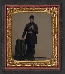 | Keywords: library of congress libraryofcongress dc:identifier=http://hdl.loc.gov/loc.pnp/ppmsca.27009 dc:identifier=httphdllocgovlocpnpppmsca27009 xmlns:dc=http://purl.org/dc/elements/1.1/ xmlns:dc=httppurlorgdcelements11 picture frame photo border [Unidentified soldier in Union uniform with knife next to table] [between 1861 and 1865] 1 photograph : sixth-plate tintype, hand-colored ; 9.4 x 8.1 cm (case) Notes: Title devised by Library staff. Case: Leather cross design. Gift; Tom Liljenquist; 2010; (DLC/PP-2010:105). Subjects: United States.--Army.--People--1860-1870. Soldiers--Union--1860-1870. Military uniforms--Union--1860-1870. Knives--1860-1870. United States--History--Civil War, 1861-1865--Military personnel--Union. Format: Portrait photographs--1860-1870. Tintypes--Hand-colored--1860-1870. Rights Info: No known restrictions on publication. Repository: Library of Congress, Prints and Photographs Division, Washington, D.C. 20540 USA, hdl.loc.gov/loc.pnp/pp.print Part Of: Ambrotype/Tintype filing series (Library of Congress) (DLC) 2010650518 Liljenquist Family collection (Library of Congress) (DLC) 2010650519 More information about this collection is available at hdl.loc.gov/loc.pnp/pp.lilj Persistent URL: hdl.loc.gov/loc.pnp/ppmsca.27009 Call Number: AMB/TIN no. 2154 [Unidentified soldier in Union uniform with knife next to table] [between 1861 and 1865] 1 photograph : sixth-plate tintype, hand-colored ; 9.4 x 8.1 cm (case) Notes: Title devised by Library staff. Case: Leather cross design. Gift; Tom Liljenquist; 2010; (DLC/PP-2010:105). Subjects: United States.--Army.--People--1860-1870. Soldiers--Union--1860-1870. Military uniforms--Union--1860-1870. Knives--1860-1870. United States--History--Civil War, 1861-1865--Military personnel--Union. Format: Portrait photographs--1860-1870. Tintypes--Hand-colored--1860-1870. Rights Info: No known restrictions on publication. Repository: Library of Congress, Prints and Photographs Division, Washington, D.C. 20540 USA, hdl.loc.gov/loc.pnp/pp.print Part Of: Ambrotype/Tintype filing series (Library of Congress) (DLC) 2010650518 Liljenquist Family collection (Library of Congress) (DLC) 2010650519 More information about this collection is available at hdl.loc.gov/loc.pnp/pp.lilj Persistent URL: hdl.loc.gov/loc.pnp/ppmsca.27009 Call Number: AMB/TIN no. 2154 |