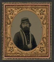 | Keywords: library of congress libraryofcongress dc:identifier=http://hdl.loc.gov/loc.pnp/ppmsca.27040 dc:identifier=httphdllocgovlocpnpppmsca27040 xmlns:dc=http://purl.org/dc/elements/1.1/ xmlns:dc=httppurlorgdcelements11 knitting scarf knitted soldier man beard mustache cap uniform oval frame picture frame photo border [Unidentified soldier in Union uniform with knitted stole] [between 1861 and 1865] 1 photograph : sixth-plate ambrotype, hand-colored ; 9.3 x 8.2 cm (case) Notes: Title devised by Library staff. Case: Leather geometric. Gift; Tom Liljenquist; 2010; (DLC/PP-2010:105). Subjects: Soldiers--Union--1860-1870. Military uniforms--Union--1860-1870. United States--History--Civil War, 1861-1865--Military personnel--Union. Format: Portrait photographs--1860-1870. Ambrotypes--Hand-colored--1860-1870. Rights Info: No known restrictions on publication. Repository: Library of Congress, Prints and Photographs Division, Washington, D.C. 20540 USA, hdl.loc.gov/loc.pnp/pp.print Part Of: Ambrotype/Tintype filing series (Library of Congress) (DLC) 2010650518 Liljenquist Family collection (Library of Congress) (DLC) 2010650519 More information about this collection is available at hdl.loc.gov/loc.pnp/pp.lilj Persistent URL: hdl.loc.gov/loc.pnp/ppmsca.27040 Call Number: AMB/TIN no. 2186 [Unidentified soldier in Union uniform with knitted stole] [between 1861 and 1865] 1 photograph : sixth-plate ambrotype, hand-colored ; 9.3 x 8.2 cm (case) Notes: Title devised by Library staff. Case: Leather geometric. Gift; Tom Liljenquist; 2010; (DLC/PP-2010:105). Subjects: Soldiers--Union--1860-1870. Military uniforms--Union--1860-1870. United States--History--Civil War, 1861-1865--Military personnel--Union. Format: Portrait photographs--1860-1870. Ambrotypes--Hand-colored--1860-1870. Rights Info: No known restrictions on publication. Repository: Library of Congress, Prints and Photographs Division, Washington, D.C. 20540 USA, hdl.loc.gov/loc.pnp/pp.print Part Of: Ambrotype/Tintype filing series (Library of Congress) (DLC) 2010650518 Liljenquist Family collection (Library of Congress) (DLC) 2010650519 More information about this collection is available at hdl.loc.gov/loc.pnp/pp.lilj Persistent URL: hdl.loc.gov/loc.pnp/ppmsca.27040 Call Number: AMB/TIN no. 2186 |