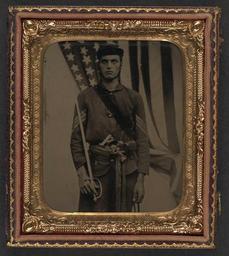 | Keywords: library of congress libraryofcongress dc:identifier=http://hdl.loc.gov/loc.pnp/ppmsca.27129 dc:identifier=httphdllocgovlocpnpppmsca27129 xmlns:dc=http://purl.org/dc/elements/1.1/ xmlns:dc=httppurlorgdcelements11 u.s. civil war uscivilwar american civil war americancivilwar the civil war thecivilwar civil war civilwar war between the states warbetweenthestates united states of america unitedstatesofamerica u.s.a. usa the union theunion union the north thenorth yankee yankees soldier sergeant non-commissioned officer noncommissionedofficer nco sash sword gun pistol revolver picture frame people photo border [Unidentified soldier in Union sergeant uniform and sash with Model 1840 non-commissioned officer's sword, revolver, cap box, and knife in front of American flag] [between 1861 and 1865] 1 photograph : sixth-plate tintype, hand-colored ; 9.2 x 8.1 cm (case) Notes: Title devised by Library staff. Case: (front) Berg, no. 4-17G; (back) leather scroll floral design. Gift; Tom Liljenquist; 2010; (DLC/PP-2010:105). Subjects: United States.--Army--People--1860-1870. Soldiers--Union--1860-1870. Military uniforms--Union--1860-1870. Daggers & swords--1860-1870. Handguns--1860-1870. Knives--1860-1870. Backdrops--1860-1870. United States--History--Civil War, 1861-1865--Military personnel--Union. Format: Portrait photographs--1860-1870. Tintypes--Hand-colored--1860-1870. Rights Info: No known restrictions on publication. Repository: Library of Congress, Prints and Photographs Division, Washington, D.C. 20540 USA, hdl.loc.gov/loc.pnp/pp.print Part Of: Ambrotype/Tintype filing series (Library of Congress) (DLC) 2010650518 Liljenquist Family collection (Library of Congress) (DLC) 2010650519 More information about this collection is available at hdl.loc.gov/loc.pnp/pp.lilj Persistent URL: hdl.loc.gov/loc.pnp/ppmsca.27129 Call Number: AMB/TIN no. 2276 [Unidentified soldier in Union sergeant uniform and sash with Model 1840 non-commissioned officer's sword, revolver, cap box, and knife in front of American flag] [between 1861 and 1865] 1 photograph : sixth-plate tintype, hand-colored ; 9.2 x 8.1 cm (case) Notes: Title devised by Library staff. Case: (front) Berg, no. 4-17G; (back) leather scroll floral design. Gift; Tom Liljenquist; 2010; (DLC/PP-2010:105). Subjects: United States.--Army--People--1860-1870. Soldiers--Union--1860-1870. Military uniforms--Union--1860-1870. Daggers & swords--1860-1870. Handguns--1860-1870. Knives--1860-1870. Backdrops--1860-1870. United States--History--Civil War, 1861-1865--Military personnel--Union. Format: Portrait photographs--1860-1870. Tintypes--Hand-colored--1860-1870. Rights Info: No known restrictions on publication. Repository: Library of Congress, Prints and Photographs Division, Washington, D.C. 20540 USA, hdl.loc.gov/loc.pnp/pp.print Part Of: Ambrotype/Tintype filing series (Library of Congress) (DLC) 2010650518 Liljenquist Family collection (Library of Congress) (DLC) 2010650519 More information about this collection is available at hdl.loc.gov/loc.pnp/pp.lilj Persistent URL: hdl.loc.gov/loc.pnp/ppmsca.27129 Call Number: AMB/TIN no. 2276 |