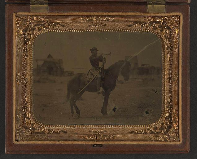 | Keywords: library of congress libraryofcongress dc:identifier=http://hdl.loc.gov/loc.pnp/ppmsca.27528 dc:identifier=httphdllocgovlocpnpppmsca27528 xmlns:dc=http://purl.org/dc/elements/1.1/ xmlns:dc=httppurlorgdcelements11 picture frame photo border [Unidentified soldier in Union uniform atop horse blowing bugle while unsheathing sword] [between 1861 and 1865] 1 photograph : quarter-plate tintype, hand-colored ; 9.9 x 12.5 cm (case) Notes: Title devised by Library staff. Case: (front) Berg, no. 1-22; (back) Berg, no. 3-17. Gift; Tom Liljenquist; 2010; (DLC/PP-2010:105). Purchased from: The Horse Soldier, Gettysburg, Pennsylvania, 2002. Published in: Davis, William C. Rebels & yankees: The fighting men of the Civil War. London, England: Salamander Books Limited, 1999, p. 47. Subjects: United States.--Army--People--1860-1870. Soldiers--Union--1860-1870. Military uniforms--Union--1860-1870. Horses--1860-1870. Daggers & swords--1860-1870. Bugles--1860-1870. Musicians--1860-1870. United States--History--Civil War, 1861-1865--Military personnel--Union. Format: Portrait photographs--1860-1870. Tintypes--Hand-colored--1860-1870. Rights Info: No known restrictions on publication. Repository: Library of Congress, Prints and Photographs Division, Washington, D.C. 20540 USA, hdl.loc.gov/loc.pnp/pp.print Part Of: Ambrotype/Tintype filing series (Library of Congress) (DLC) 2010650518 Liljenquist Family collection (Library of Congress) (DLC) 2010650519 More information about this collection is available at hdl.loc.gov/loc.pnp/pp.lilj Persistent URL: hdl.loc.gov/loc.pnp/ppmsca.27528 Call Number: AMB/TIN no. 5019 [Unidentified soldier in Union uniform atop horse blowing bugle while unsheathing sword] [between 1861 and 1865] 1 photograph : quarter-plate tintype, hand-colored ; 9.9 x 12.5 cm (case) Notes: Title devised by Library staff. Case: (front) Berg, no. 1-22; (back) Berg, no. 3-17. Gift; Tom Liljenquist; 2010; (DLC/PP-2010:105). Purchased from: The Horse Soldier, Gettysburg, Pennsylvania, 2002. Published in: Davis, William C. Rebels & yankees: The fighting men of the Civil War. London, England: Salamander Books Limited, 1999, p. 47. Subjects: United States.--Army--People--1860-1870. Soldiers--Union--1860-1870. Military uniforms--Union--1860-1870. Horses--1860-1870. Daggers & swords--1860-1870. Bugles--1860-1870. Musicians--1860-1870. United States--History--Civil War, 1861-1865--Military personnel--Union. Format: Portrait photographs--1860-1870. Tintypes--Hand-colored--1860-1870. Rights Info: No known restrictions on publication. Repository: Library of Congress, Prints and Photographs Division, Washington, D.C. 20540 USA, hdl.loc.gov/loc.pnp/pp.print Part Of: Ambrotype/Tintype filing series (Library of Congress) (DLC) 2010650518 Liljenquist Family collection (Library of Congress) (DLC) 2010650519 More information about this collection is available at hdl.loc.gov/loc.pnp/pp.lilj Persistent URL: hdl.loc.gov/loc.pnp/ppmsca.27528 Call Number: AMB/TIN no. 5019 |