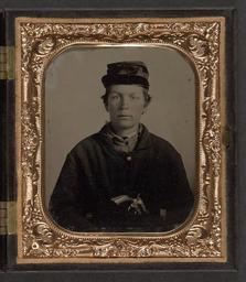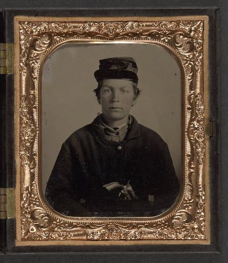 | Keywords: library of congress libraryofcongress dc:identifier=http://hdl.loc.gov/loc.pnp/ppmsca.26901 dc:identifier=httphdllocgovlocpnpppmsca26901 xmlns:dc=http://purl.org/dc/elements/1.1/ xmlns:dc=httppurlorgdcelements11 u.s. civil war uscivilwar american civil war americancivilwar the civil war thecivilwar civil war civilwar war between the states warbetweenthestates united states of america unitedstatesofamerica u.s.a. usa the union theunion union the north thenorth yankee yankees soldier pistol revolver gun picture frame people photo border [Unidentified young soldier in Union uniform and forage cap with revolver] [between 1861 and 1865] 1 photograph : sixth-plate tintype, hand-colored ; 9.5 x 8.5 cm (case) Notes: Title devised by Library staff. Case: Berg, no. 3-110. Gift; Tom Liljenquist; 2010; (DLC/PP-2010:105). Subjects: United States.--Army--People--1860-1870. Soldiers--Union--1860-1870. Military uniforms--Union--1860-1870. Youth--1860-1870. Handguns--1860-1870. United States--History--Civil War, 1861-1865--Military personnel. Format: Portrait photographs--1860-1870. Tintypes--Hand-colored--1860-1870. Rights Info: No known restrictions on publication. Repository: Library of Congress, Prints and Photographs Division, Washington, D.C. 20540 USA, hdl.loc.gov/loc.pnp/pp.print Part Of: Ambrotype/Tintype filing series (Library of Congress) (DLC) 2010650518 Liljenquist Family collection (Library of Congress) (DLC) 2010650519 More information about this collection is available at hdl.loc.gov/loc.pnp/pp.lilj Persistent URL: hdl.loc.gov/loc.pnp/ppmsca.26901 Call Number: AMB/TIN no. 2048 [Unidentified young soldier in Union uniform and forage cap with revolver] [between 1861 and 1865] 1 photograph : sixth-plate tintype, hand-colored ; 9.5 x 8.5 cm (case) Notes: Title devised by Library staff. Case: Berg, no. 3-110. Gift; Tom Liljenquist; 2010; (DLC/PP-2010:105). Subjects: United States.--Army--People--1860-1870. Soldiers--Union--1860-1870. Military uniforms--Union--1860-1870. Youth--1860-1870. Handguns--1860-1870. United States--History--Civil War, 1861-1865--Military personnel. Format: Portrait photographs--1860-1870. Tintypes--Hand-colored--1860-1870. Rights Info: No known restrictions on publication. Repository: Library of Congress, Prints and Photographs Division, Washington, D.C. 20540 USA, hdl.loc.gov/loc.pnp/pp.print Part Of: Ambrotype/Tintype filing series (Library of Congress) (DLC) 2010650518 Liljenquist Family collection (Library of Congress) (DLC) 2010650519 More information about this collection is available at hdl.loc.gov/loc.pnp/pp.lilj Persistent URL: hdl.loc.gov/loc.pnp/ppmsca.26901 Call Number: AMB/TIN no. 2048 |