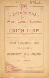 | Keywords: text document writing An arrangement of text with the Union Steam Ship Co flag at the top. Printed at the Otago Daily Times Office. Inscriptions: Inscribed - Recto - top right: Mr Baker. Quantity: 1 colour photo-mechanical print(s) on booklet cover.. Physical Description: Letterpress, on cover 213 x 138 mm. Provenance: Because of the inscription on the cover, possibly previously owned by Mr John Holland Baker, a government surveyor employed in Southland. Otago daily times (Newspaper). Union Steam Ship Company of New Zealand Limited :Excursions to the West Coast Sounds by the Union Line. Nineteenth season, thirty-second trip. First excursion, 1896, from Dunedin on Wednesday, 22 January. S.S. Tarawera. [Cover of booklet]. 1896.. Ref: Eph-A-SHIP-1896-01. Alexander Turnbull Library, Wellington, New Zealand. natlib.govt.nz/records/22684781 An arrangement of text with the Union Steam Ship Co flag at the top. Printed at the Otago Daily Times Office. Inscriptions: Inscribed - Recto - top right: Mr Baker. Quantity: 1 colour photo-mechanical print(s) on booklet cover.. Physical Description: Letterpress, on cover 213 x 138 mm. Provenance: Because of the inscription on the cover, possibly previously owned by Mr John Holland Baker, a government surveyor employed in Southland. Otago daily times (Newspaper). Union Steam Ship Company of New Zealand Limited :Excursions to the West Coast Sounds by the Union Line. Nineteenth season, thirty-second trip. First excursion, 1896, from Dunedin on Wednesday, 22 January. S.S. Tarawera. [Cover of booklet]. 1896.. Ref: Eph-A-SHIP-1896-01. Alexander Turnbull Library, Wellington, New Zealand. natlib.govt.nz/records/22684781 |