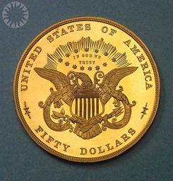 | Keywords: legendary coins legendarycoins numismatics money smithsonian probably public domain probablypublicdomain round circle indoor SI Neg. 2005-27355. Date: 9/1/2005...Some twenty years after the private sector had abandoned the idea of a fifty-dollar gold piece in the mid-1850s, the Philadelphia Mint considered the possibility of a federal coin of this denomination. There was even talk of a "Union", or hundred-dollar coin, and a drawing or two has survived to suggest what the Mint had in mind. But in the end, no such coin was ever produced. .The project went a bit farther in the case of the "Half Union." Dies were prepared, the work of William Barber (father of the eventual Mint Chief Engraver Charles E. Barber). .Barber's obverse and reverse designs look vaguely akin to Longacre's work for the double eagle. A few patterns were struck in copper and two in gold; the latter share a reverse die but each has a slightly different obverse die. The project was abandoned soon afterwards, as it became apparent that the new coin simply wasn't needed..Click here to view the reverse...Credit: Tom Mulvaney (Smithsonian Institution) SI Neg. 2005-27355. Date: 9/1/2005...Some twenty years after the private sector had abandoned the idea of a fifty-dollar gold piece in the mid-1850s, the Philadelphia Mint considered the possibility of a federal coin of this denomination. There was even talk of a "Union", or hundred-dollar coin, and a drawing or two has survived to suggest what the Mint had in mind. But in the end, no such coin was ever produced. .The project went a bit farther in the case of the "Half Union." Dies were prepared, the work of William Barber (father of the eventual Mint Chief Engraver Charles E. Barber). .Barber's obverse and reverse designs look vaguely akin to Longacre's work for the double eagle. A few patterns were struck in copper and two in gold; the latter share a reverse die but each has a slightly different obverse die. The project was abandoned soon afterwards, as it became apparent that the new coin simply wasn't needed..Click here to view the reverse...Credit: Tom Mulvaney (Smithsonian Institution) |