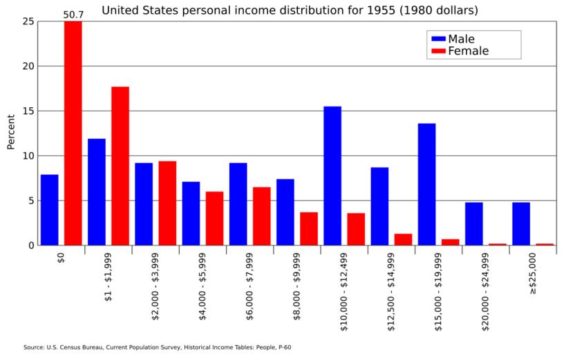 | Keywords: United States personal income by sex in 1980 dollars-1955.svg translate yes en Distribution of personal income by sex in the United States in 1955 in 1980 dollars Source U S Census Bureau Current Population Survey Historical Income People https //www2 census gov/prod2/popscan/p60-132 pdf P-60 Table 44 pgs 138-140 2016-05-05 own Delphi234 other versions Note wikitable - 1980 dollars 2014 dollars - 2 000 5 746 - 4 000 11 492 - 6 000 17 238 - 8 000 22 984 - 10 000 28 730 - 12 500 35 913 - 15 000 43 095 - 20 000 57 460 - 25 000 71 825 cc-zero Income distribution in the United States Personal income in the United States |