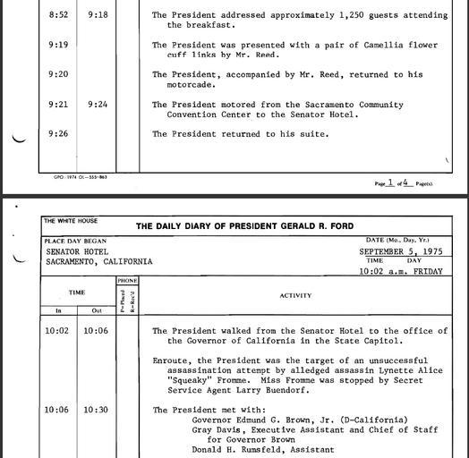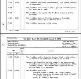 | Keywords: United States presidential daily diary, Ford, 19750905 partial.png U S President Gerald Ford cropped September 5 1975 - 8 52 a m to 10 30 a m Location Sacramento California <br><br>The Ford assassination attempt in Sacramento was a September 5 1975 effort by cultist Charles Manson Family member Lynette Squeaky Fromme to kill U S President Gerald Ford in California Ford was in Sacramento that morning to speak at an annual California Host Breakfast The above file is pages from Ford's Daily Diary shows that Ford spoke for 26 minutes at the Host Breakfast and returned to the Senator Hotel He left the Senator Hotel at 10 02 am and walked to the California State Capitol arriving at 10 06 am Between that time the diary notes with little detail that Fromme tried to assassinate Ford Ford himself waited until the end of his meeting with the California Governor to mention that someone had jus tried to kill him The scant text in the September 5 1975 Daily Diary of President Gerald R Ford about the assassination attempt seems to reflect that nonchalant approach by the Ford administration to the assassination attempt 1975-09-05 Gerald R Ford Presidential Library Citation White House September 5 1975 Daily Diary of President Gerald R Ford September 5 1975 President's Daily Diary Collection Box 77 at the Gerald R Ford Presidential Library 12 http //www fordlibrarymuseum gov/library/document/0036/pdd750905 pdf November 27 2012 The White House PD-USGov Institution Institution Gerald R Ford Presidential Museum Gerald R Ford Presidential Library and Museum-cooperation PD-USGov 1975 works in the United States Ford assassination attempt in Sacramento Diary Scanned English texts United States presidential daily diary Ford 1975-09 Documents at the Gerald R Ford Presidential Library and Museum |